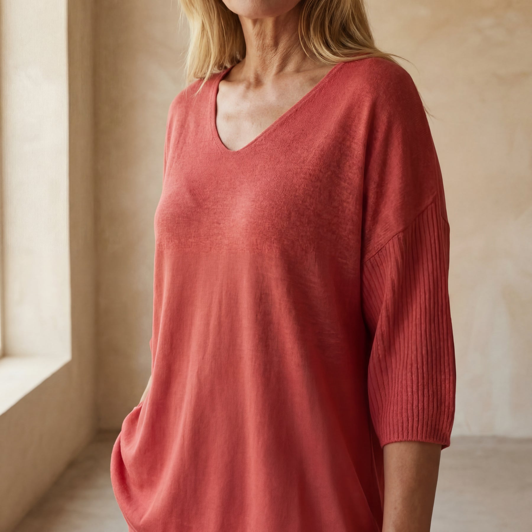 Celia - Breathable Cotton Top redefines everyday essentials with its soft, fine-knit craftsmanship. Featuring a flattering V-neckline and a relaxed silhouette, this piece offers a sophisticated touch that transitions seamlessly from home to a sunny afternoon out.